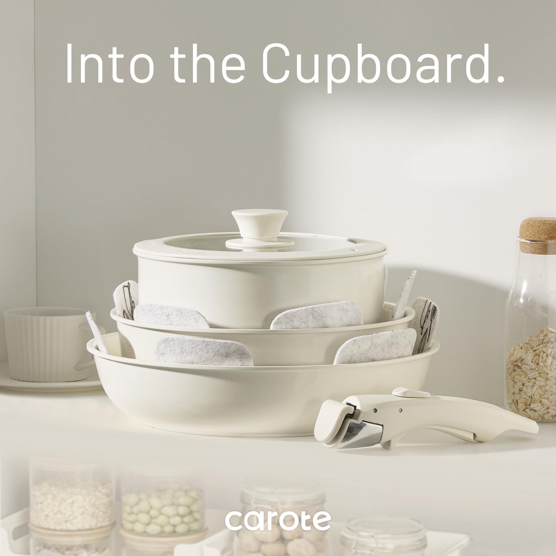- · Sorage Hack: Optimal storage and easy stacking with the handles off saves up to 70% more space of Carote detachable handle pots and pans set.