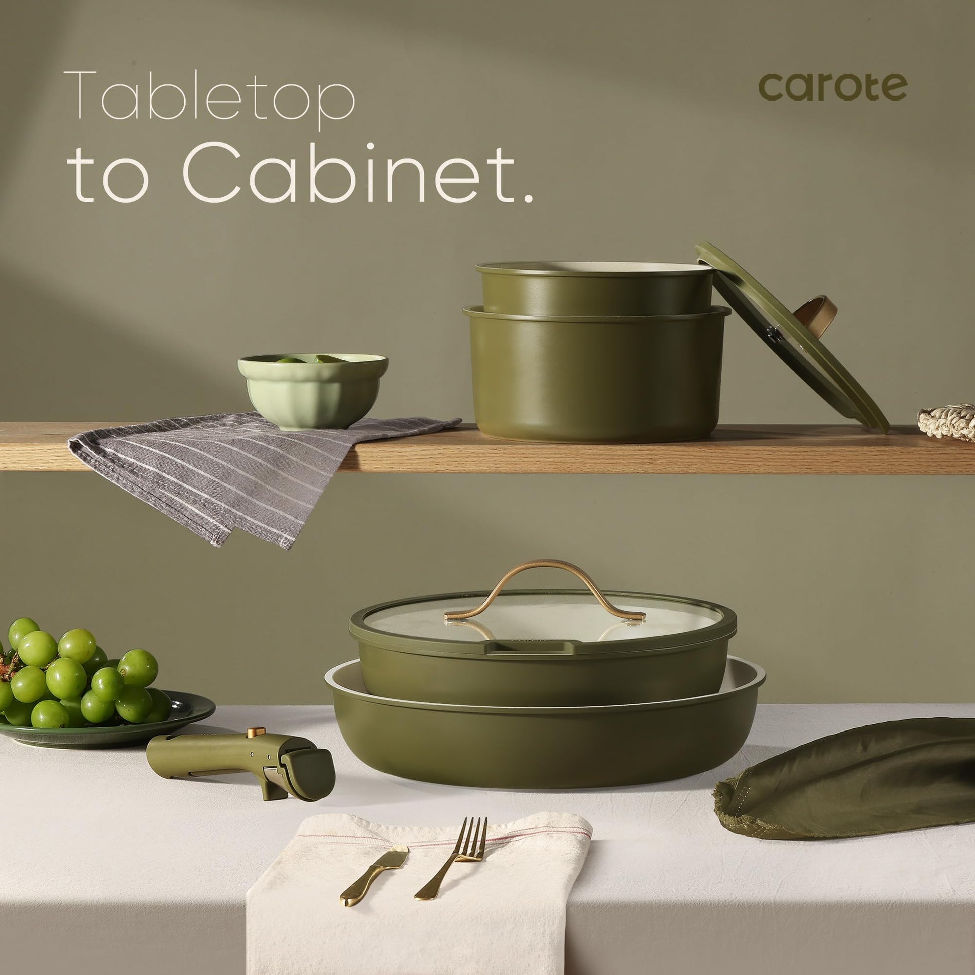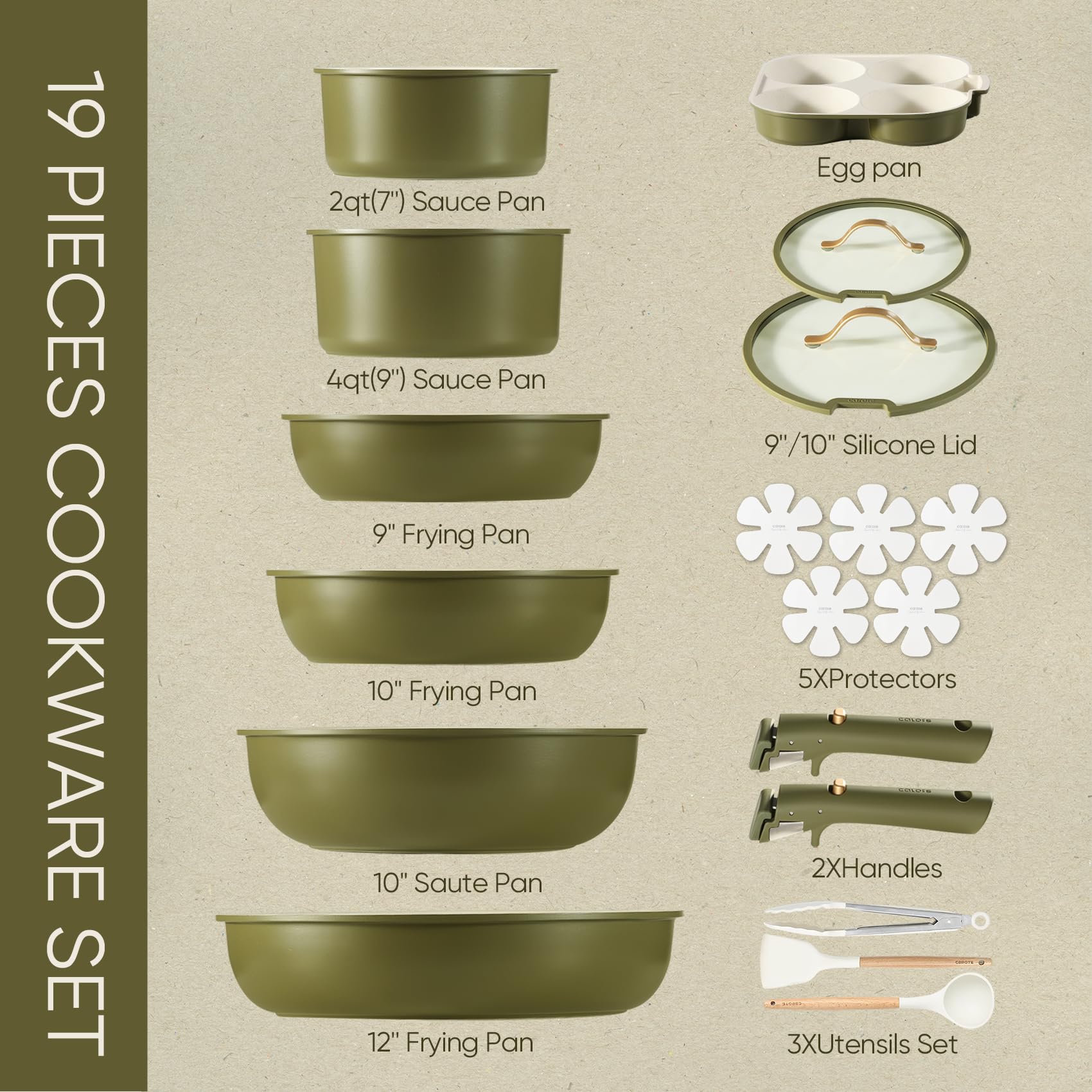 Details: CAROTE 19pcs Pots and Pans Set, Nonstick Cookware Set Detachable Handle, Induction Kitchen Cookware Sets Non Stick with Removable Handle, RV Cookware Set, Gold and Green
