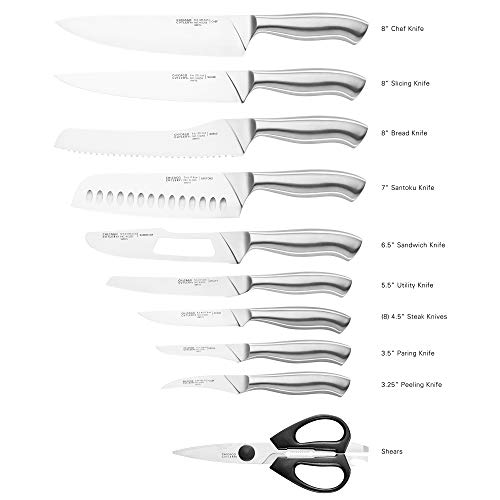 Details: Comfortably contoured stainless-steel handles hold the high-carbon stainless-steel blades. Guided Grip design helps you handle the knives like a professional chef—for dicing, peeling, paring and chopping. Includes steak knives and a wood block with a built-in sharpener to keep your set safe and secure.