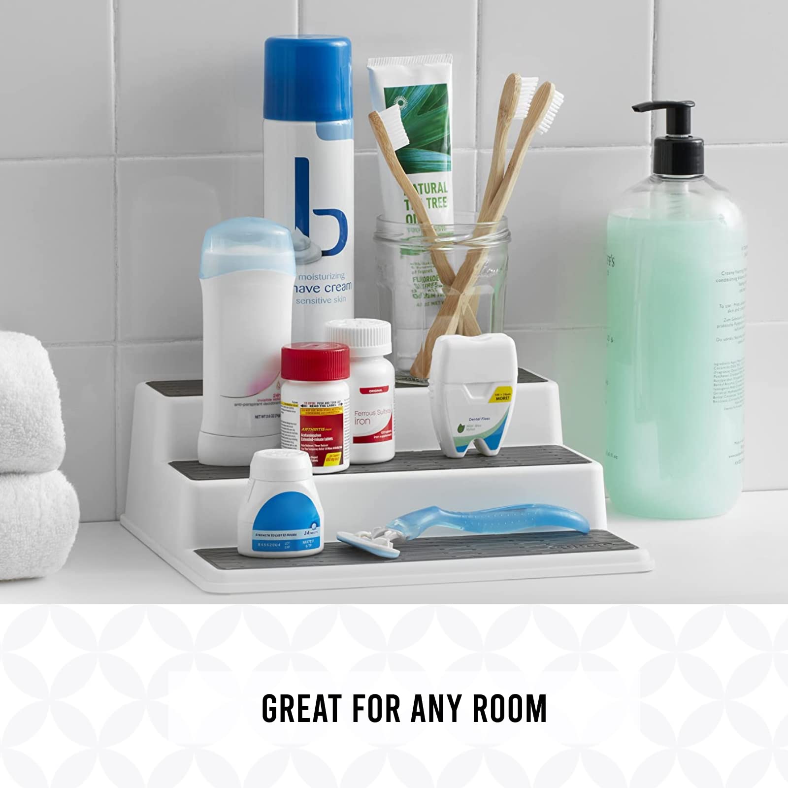 - NON-SLIP SHELVES: The step shelf organizer features a non-slip shelf lining; clean with a damp cloth when needed