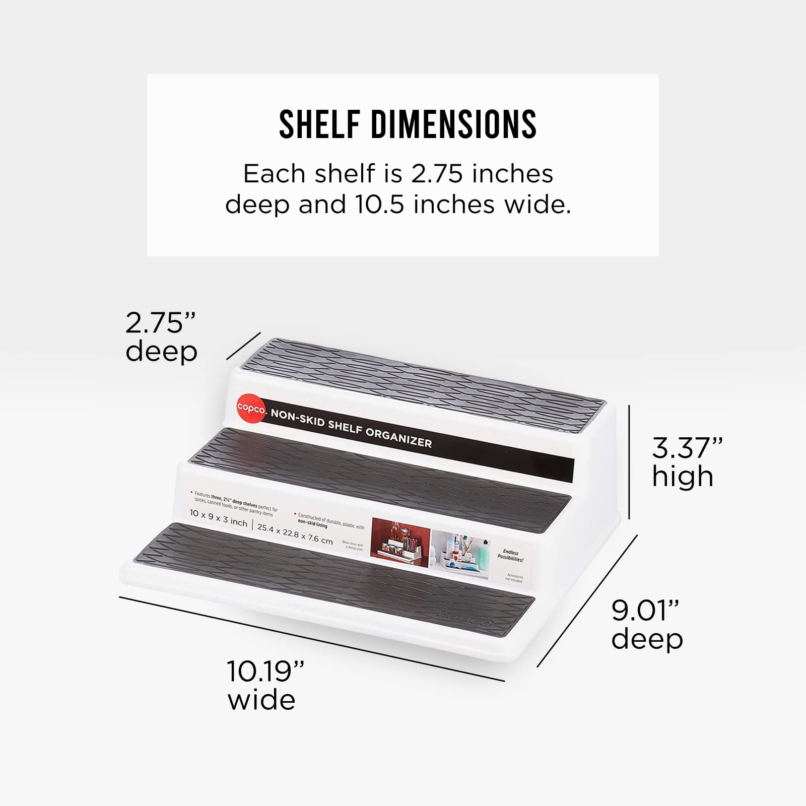 Details: With the Copco Non-Skid 3-Tier Cabinet Organizer you can keep your cabinets organized and your items conveniently in view. The three-tier design can be used as a spice rack or a can organizer for the pantry. Layer your favorite spices, cans or sauces while keeping their labels in view. You can also use this organizer to display figurines, office supplies and more. Use it to organize perfume, nail polish or other beauty products. It can comfortably fit about 18-24 spice jars, depending on size. It can also hold about 15 standard cans (5 on each tier). Each shelf is 2 3/4-inch deep. This organizer can be used on your countertop or hidden in a cabinet. Buy multiples to organize any room in your house or apartment. You'll find endless uses for this tiered organizer.