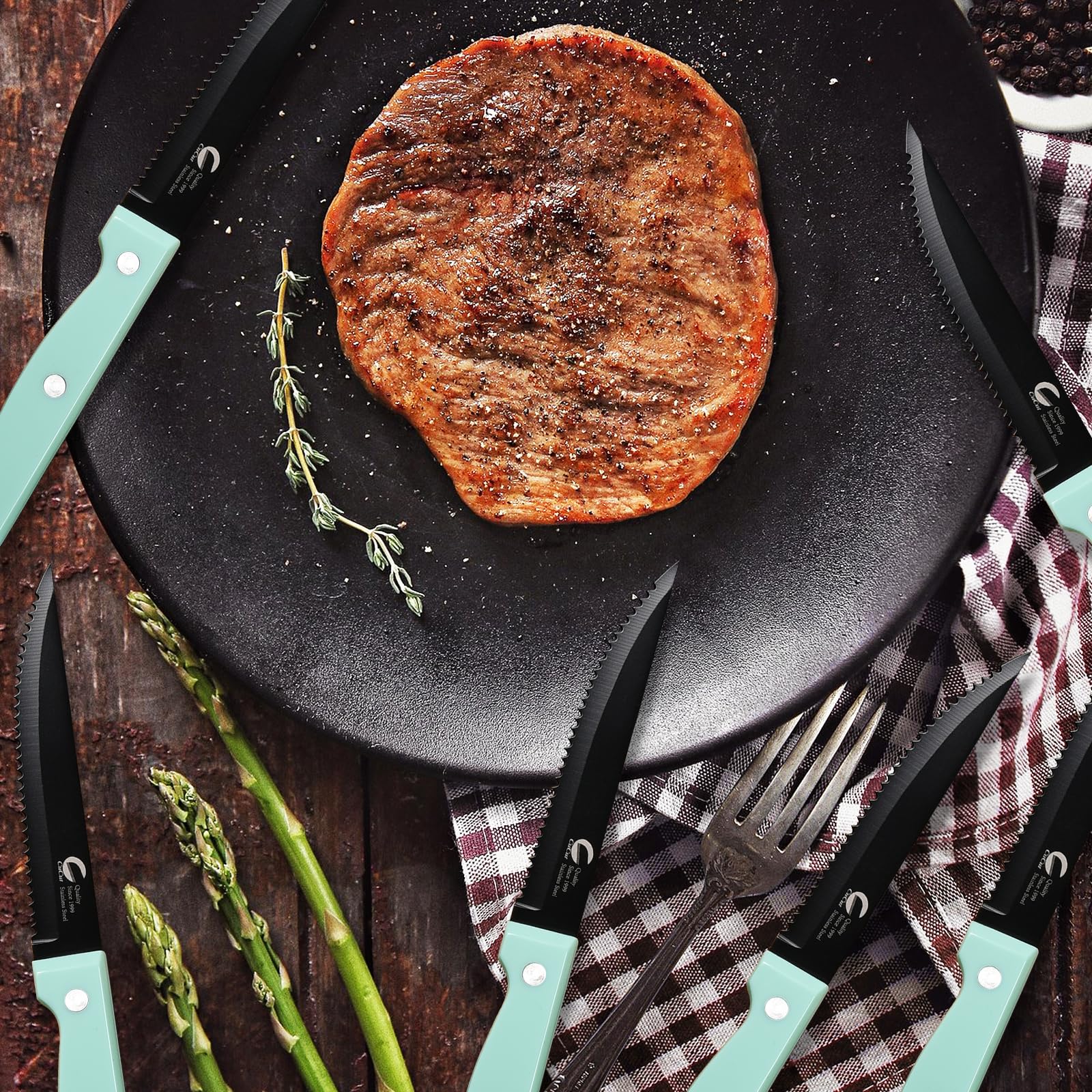 - 【FOOD-GRADE CARBON-BASED COATING】The knife's surface features a high-polymer precision coating that resists stains and pitting. The ergonomically designed serrated steak knife excels in meat cutting. It prevents water erosion, rust, and is dishwasher safe.