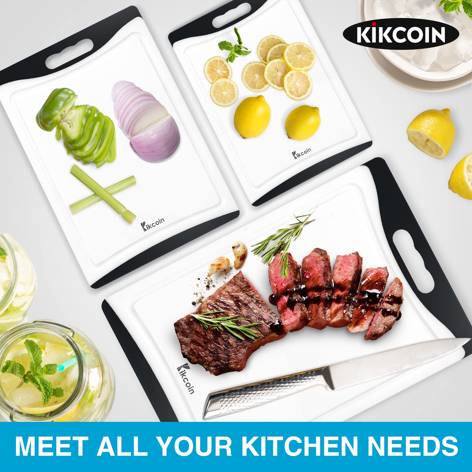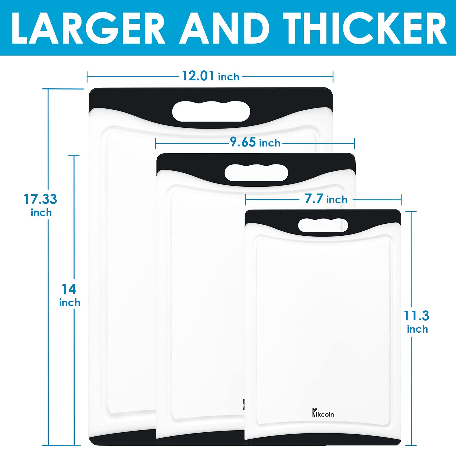 - 【Meet All Kitchen Needs】Kikcoin extra large cutting board set includes 3 cutting boards of various sizes: an extra large size (17.33*12.0*0.4 inch) suitable for meat or steak; a large size (14.0*9.65*0.36 inch) suitable for vegetables; a medium size (11.3*7.7*0.36 inch) suitable for fruit. Various sizes of chop cutting board can be used for different area.