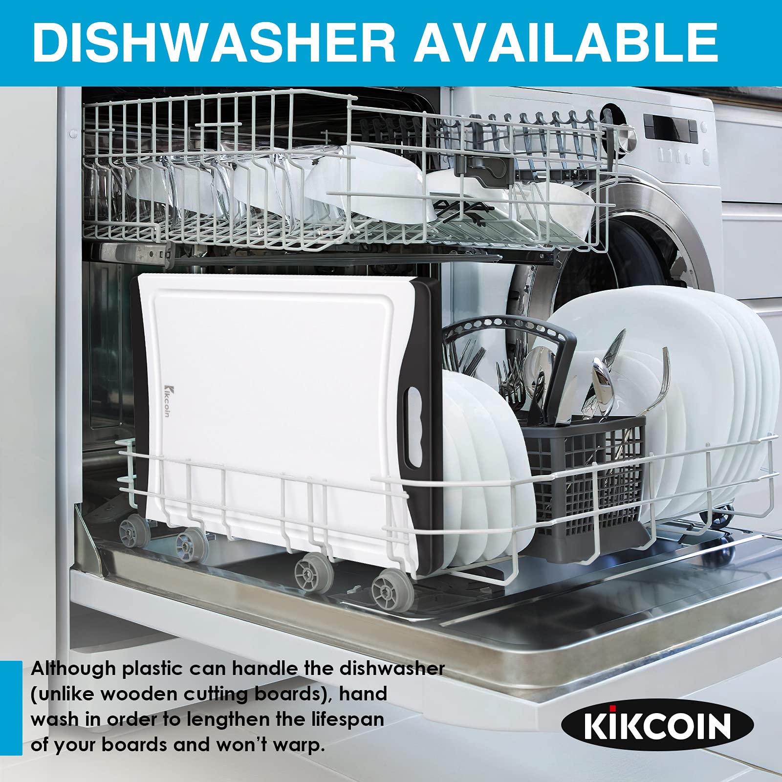 - 【High-density】Kikcoin cutting board set are made of high-density materials, which are thicker and heavier than ordinary cutting boards. It will not hurt the board or the knife when chopped, nor will it split or crack. And water is not easy to penetrate this cutting board, so the boards are dishwasher washable.