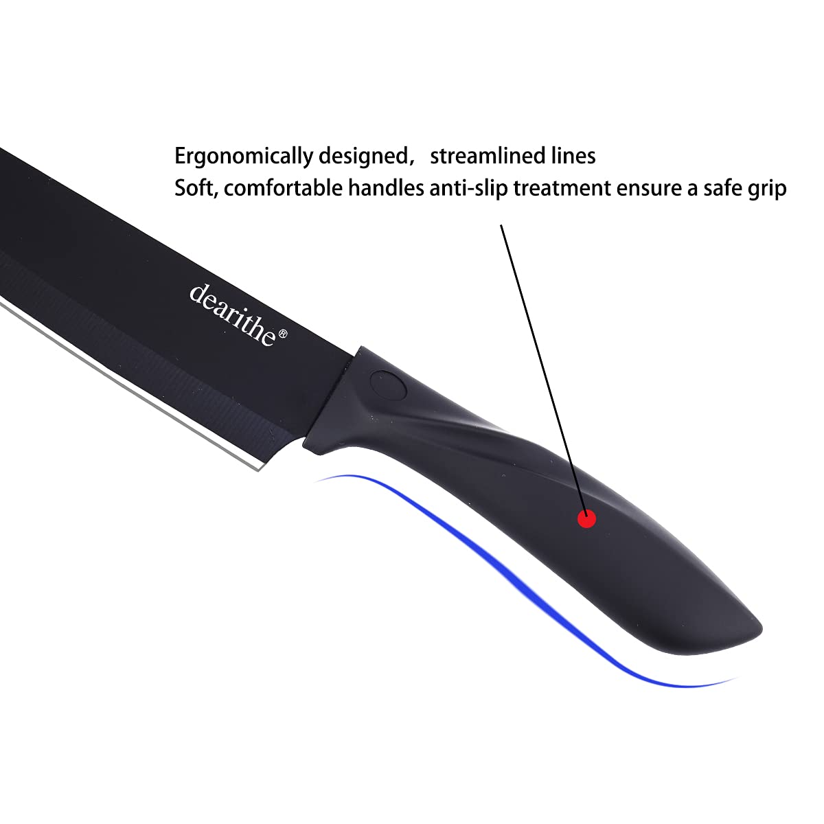 - 【Non stick coating blade and Ergonomic handle】 This kitchen knives features easy to clean non-stick coating ,for Anti-rusting and Sharp. The surface of the ergonomically designed handle is not only made anti-slip treatment, but also has streamlined lines. The matte texture is very soft and comfortable. Even if you hold it for a long time, won’t feel tired.