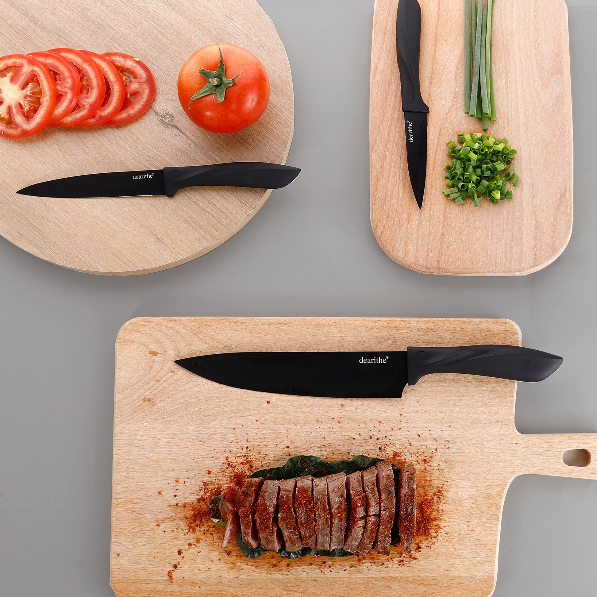 This kitchen knives features easy to clean non-stick coating ,for Anti-rusting and Sharp. The surface of the ergonomically designed handle is made anti-slip treatment, has streamlined lines. The matte texture is very sofe and comfortable.