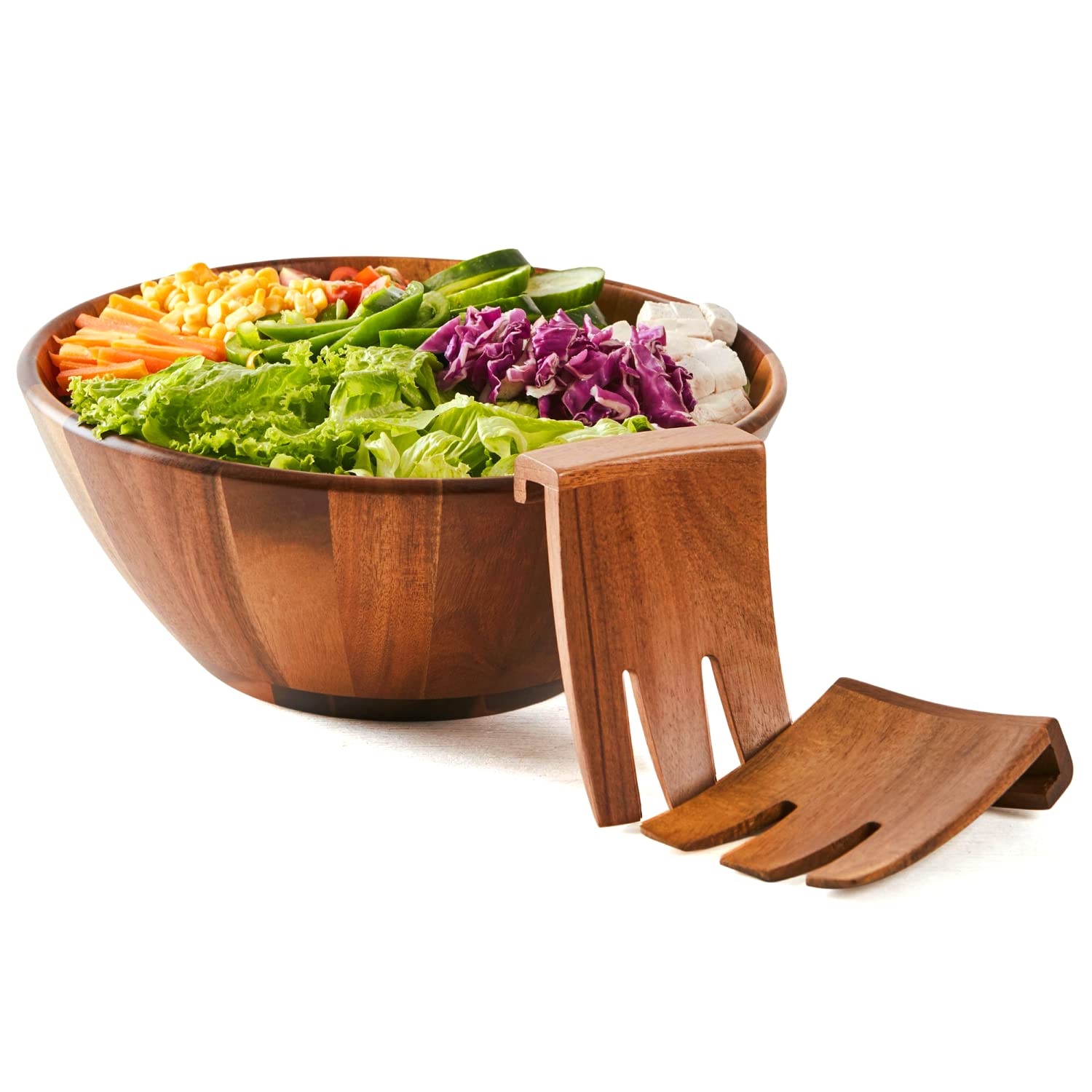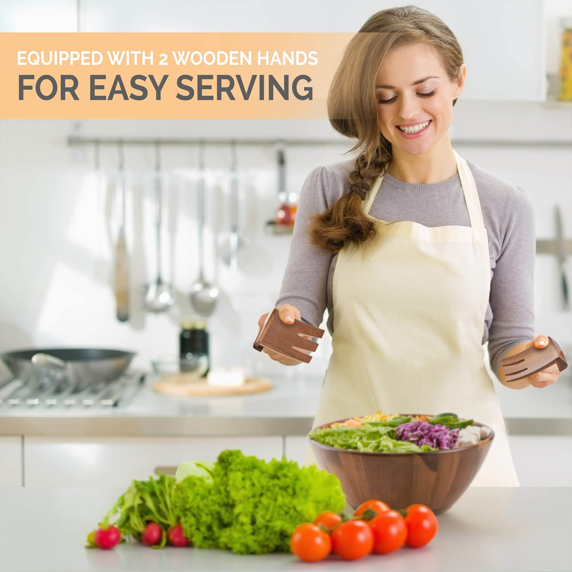 - ✅ You'll Have an Extra Pair of Hands ... Mixing and serving your favorite salad will be a delight. Every wood serving bowl comes with a pair of matching salad hands. And, you won't need an extra plate to place the mixing spoons - they conveniently hang onto the sides.