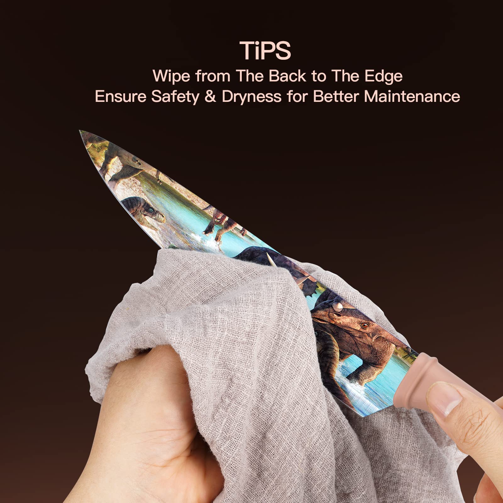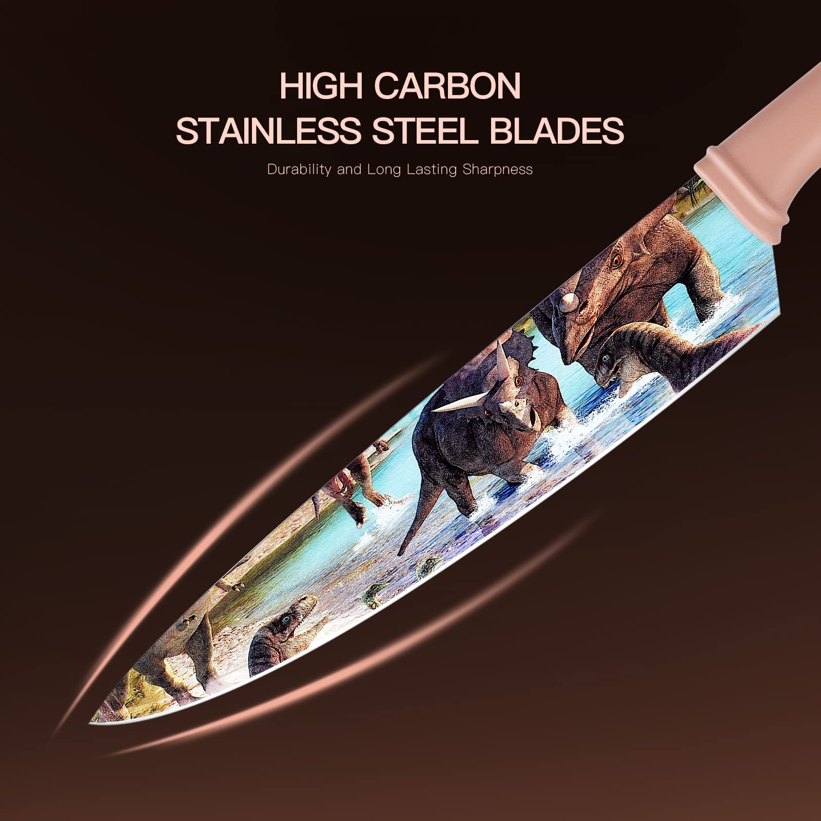 - INGENIOUS LOOK: The sharp chef's knife has a unique look compared to other ordinary knife sets. The Dinosaur pattern blade provides an exquisite appearance and comfortable oval handle provides better grip. Make cooking into a pleasure!