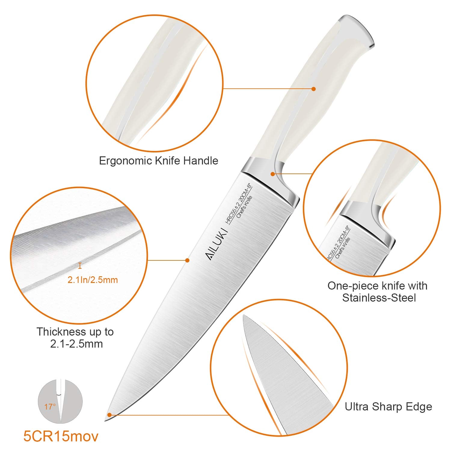 - 🔪 18-piece Kitchen Knife Set: Our Off White Knife Set is with all-in one complete set which include Chef Knife,Santoku Knife, Utility Knife,Bread Cutter,Slicing Knife, Steak Knivies, Paring Knife, Scissors, Knife Sharpener .This Knife Set is well equipped to meet all your basic need.