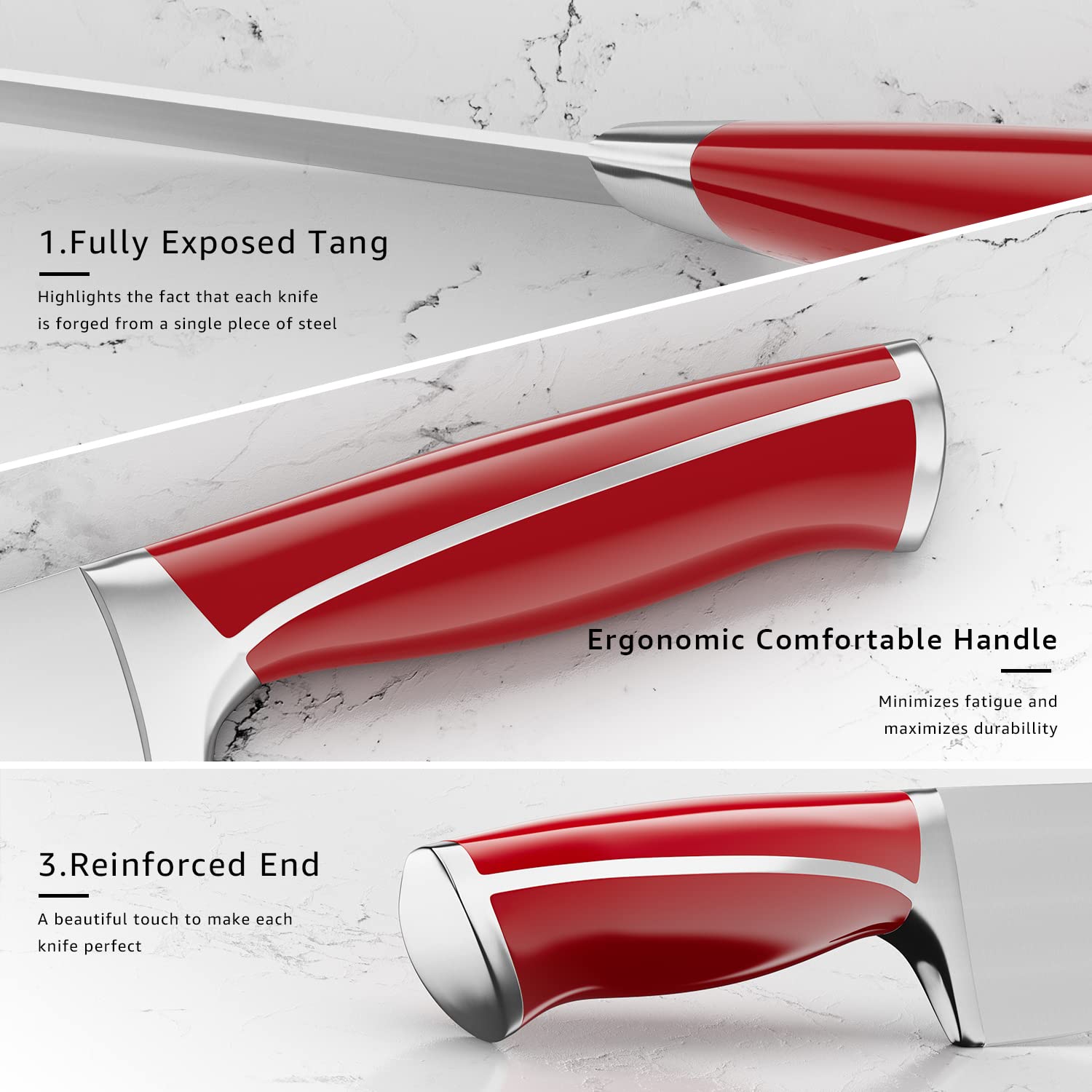 - 【Premium Sharp】Ultra sharp, full tang, rust proof technology, with carefully hand-polishing and precise tempering technology, each set of kitchen knives taper-ground edge is hand polished to 16°, providing optimum sharpness and precision and effortlessly to cutting meat, vegetables, fruit, etc.