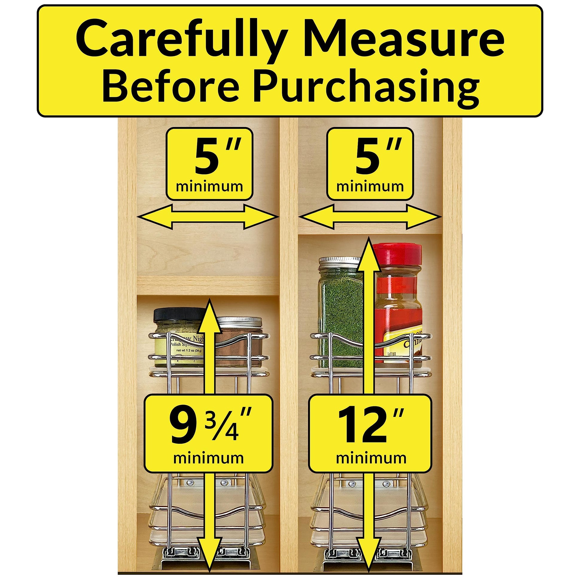 Details: Lynk Professional® transforms any cabinet in your kitchen or pantry to the beauty and convenience of our slide out spice rack organizers, ideal for narrow cabinets. This innovative spice storage solution gives easy slide out access to all the hidden spices in your kitchen cabinets and pantry. Our ProGlide® Plus 2™ industrial-grade full-extension dual ball bearing glides ensure smooth sliding and is engineered to clear any cabinet lip. Our exclusive design even adjusts to extend up to an extra 2” further than ordinary full-extension glides, ensuring a perfect fit and complete access to all spices and bottles in deeper upper cabinets. No need for special jars, you can keep your herbs and spices in their original containers. This special spice holder rack eliminates clutter in your cabinets, pantries, drawers, and on your countertops. The heavy-duty thick polymer trays lock into place and protect your cabinets from spills while keeping even the smallest items stable. Our spice and seasoning organizer, professionally engineered with commercial quality steel and a beautiful chrome finish, gives you unparalleled strength and durability for a lifetime of trouble-free use. And our proprietary Easy Mount® design requires no measuring and installs in minutes - just 2 screws (included); no need to remove shelves. The Lynk Professional pull out double spice rack holds up to 20 standard size spice jars (jars not included). The Lynk Professional® Spice Rack is available in multiple designs and sizes to fit all your needs. US Patent # D876,169 Product Dimensions: 4-1/4" W x 10-1/4" to 12-1/4" inch deep x 8-1/2" H. Alternative names our customers use to find our product: spice racks for inside cabinets, pantry spice organizer, cabinet pull out shelves, spice rack organizer for cabinet with jars, condiments organizer kitchen for cabinet, roll out shelves for kitchen cabinets, spice rack for cabinet door, spice jar organizer, sauce organizer for cabinet.