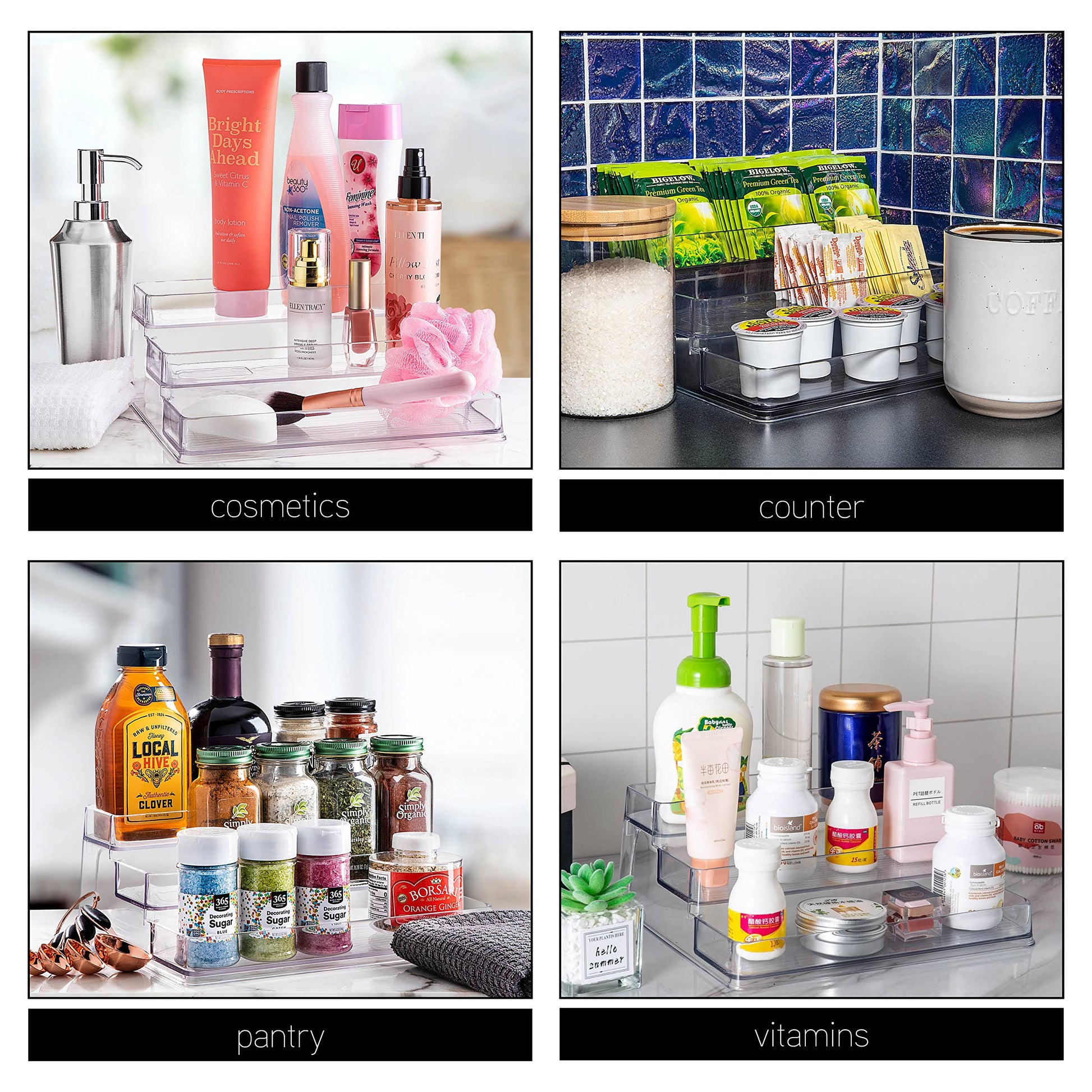 - "ET INCLUDES: This rack has three tiers to increase visibility and easy access to the items on your kitchen counter or cabinets. Deep shelves helps to prevent spills from spreading. Each rack measures 10.5" (W) x 9.5" (D) x 4.25" (H) and can fit around 5 standard size spice bottle on each shelf.
