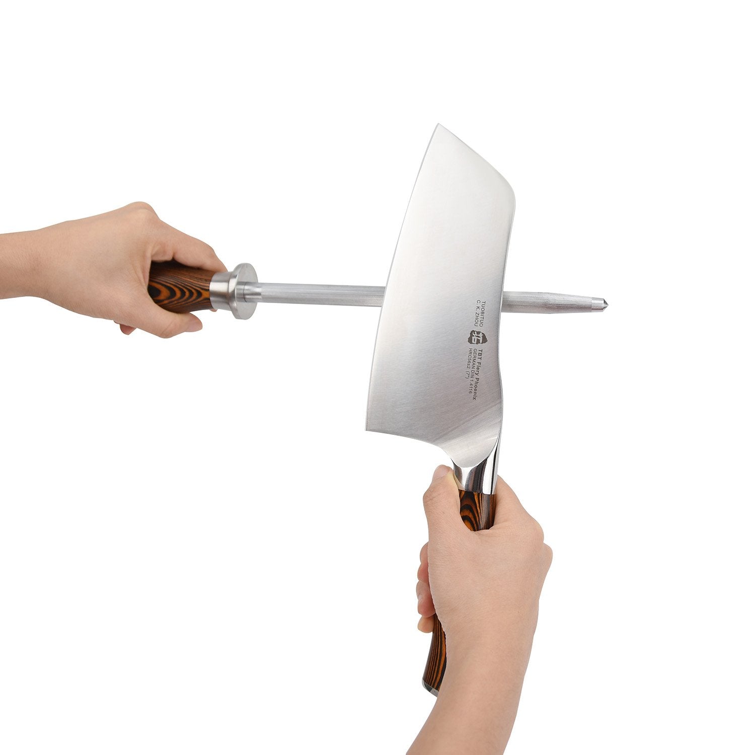 - AFFORDABLE KNIFE SET: This high carbon stainless steel cutlery set includes 7” Cleaver, 7” Granton Santoku, 6” Chopping Knife, 5” Kitchen Utility Knife, 4”Paring Knife, 8” Honing Steel, All-Purpose Shears, and Wooden Block,which can be used in many situations, whether at home or in a restaurant. It is also the best choice for you to give as a gift to your friends.